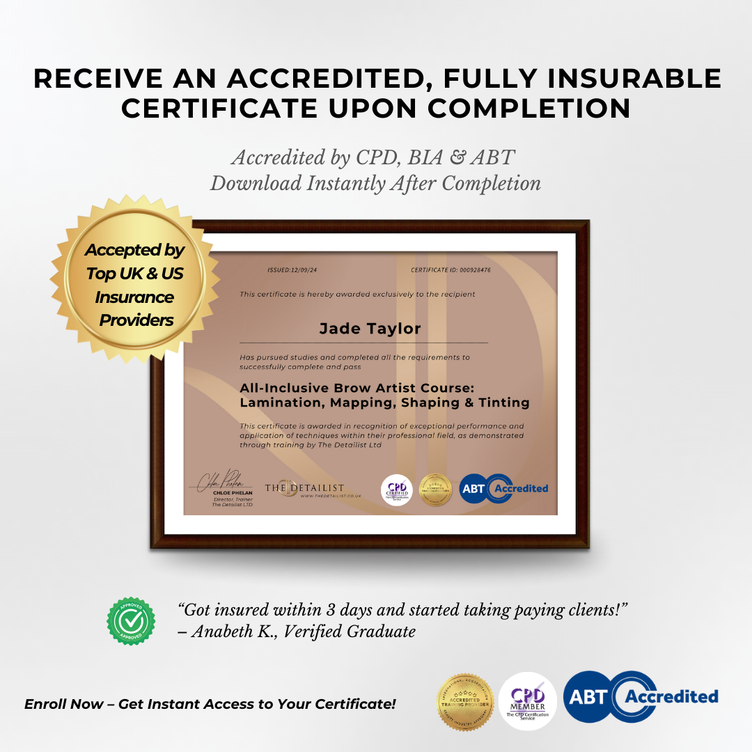 Absolutely. Upon completion, you’ll receive a CPD, BIA & ABT accredited certificate — fully insurable and recognised in the UK and internationally.